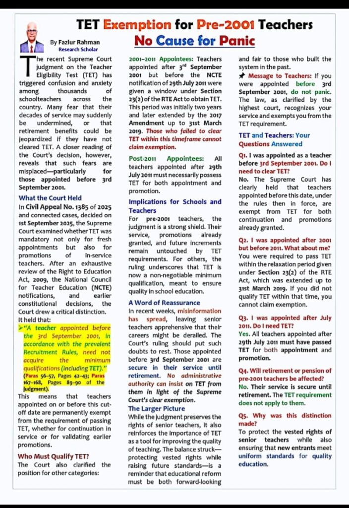 • ప్రకారం TET అమలుకు ముందు నియామకమైన ఉపాధ్యాయులకు TET నుండి మినహాయించడమైనది.