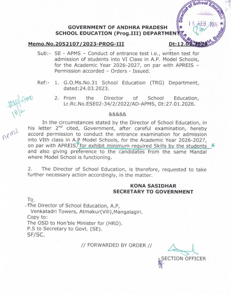 - Entrance Examination For Admission into sixth class AP Model Schools Proceedings Dt 12/02/2026